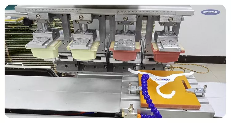 4-цветная тампопечатная машина с рабочим столом с остановочным челноком и 4-мя печатающими головками. Эту машину можно использовать как 1-цветный тампонный принтер с четырьмя головками.