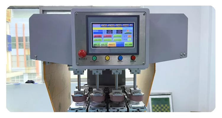4-цветная тампопечатная машина для шлемов, оснащенная сенсорной панелью для управления.